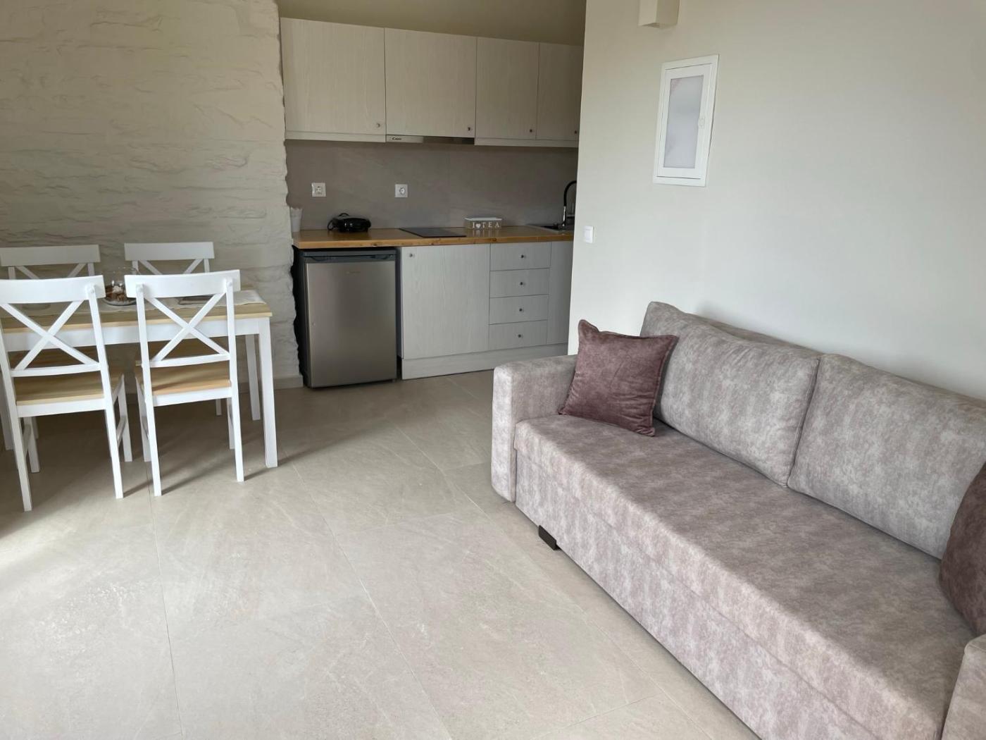 One-Bedroom Apartment with Sea View. Featuring a private entrance, this air-conditioned apartment is comprised of 1 living room, 1 separate bedroom and 1 bathroom with a walk-in shower and a hairdryer. The kitchenette is fitted with a stovetop, a refrigerator and kitchenware. The apartment features tiled floors, a seating area with a flat-screen TV, soundproof walls, a tea and coffee maker as well as sea views. The unit offers 2 beds.